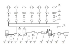 上 圖結(jié)構(gòu)示意圖中1為原水箱、2為聚合氯化鋁加藥裝置、3為增壓泵、4為多介質(zhì)過濾器、5為活性炭過濾器、6為阻垢劑加藥裝置、7為精密過濾器、8為膜分離裝置、9為凈水箱、10為消毒器、11為灌裝機、12為全自動變頻控制器、13為儲水器、14為閥門、15為電機、16為用戶單元。